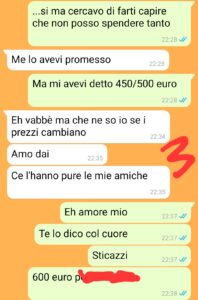 “Ciao ragazzi, un saluto a tutti voi di spunteblu e anche ai vostri follower. Non pensavo che vi avrei mai scritto ma è da un po’ che vivo una situazione surreale e che vi penso 😅e oggi secondo me la cosa ha raggiunto il limite.  L’amore fa fare cose strane. Poi in un attimo apri gli occhi e ti rendi conto delle caz*ate che hai fatto…e torni in te. Io sono un ragazzo di 27 anni, faccio un lavoro normale, vivo da solo e cerco di essere indipendente. In questi mesi sono stato insieme a una ragazza che sinceramente amo tanto…ma forse nel modo sbagliato.  Perché l’ho accontentata in ogni modo…come per ottenere il suo amore in cambio…ma è stato un errore. Perché ora secondo lei è normale chiedermi regali esagerati…e ne vuole sempre di più.  Ho usato quasi tutti i miei risparmi in questi mesi…e mi rendo conto solo ora che è stato completamente inutile…perché a lei interessa più dei regali che di me….e adesso basta….”
