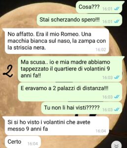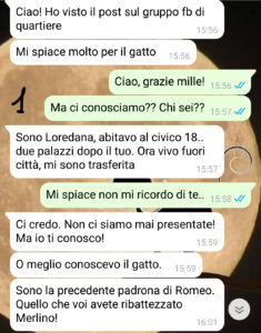 La sera sono andata con mia madre a cercarlo e lo abbiamo trovato. Era chiaramente un gatto di casa: si è fatto subito accarezzare.. ci ha seguito fino a casa e noi lo abbiamo fatto salire.