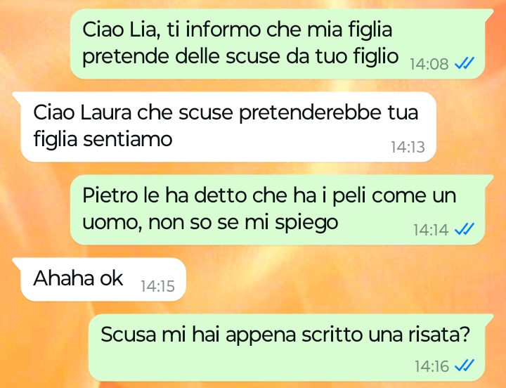 “Ciao Spunte Blu, mi chiamo Laura e vi scrivo perché sono nauseata dalla cosa che mi è appena successa e dall’ignoranza terribile di certe persone. Sono mamma di una bambina che frequenta le scuole elementari. Mia figlia è una bimba buonissima, volenterosa e non ha mai dato fastidio a nessuno. Oggi però è tornata da scuola piangendo per via di una cosa successa con un suo compagno di classe, una cosa assolutamente grave, così ho contattato subito la mamma di questo suo compagno di classe. E guardate un poco cosa e come mi ha risposto questa mamma. Che maleducazione assurda c’è in giro! Io sono veramente scioccata.”