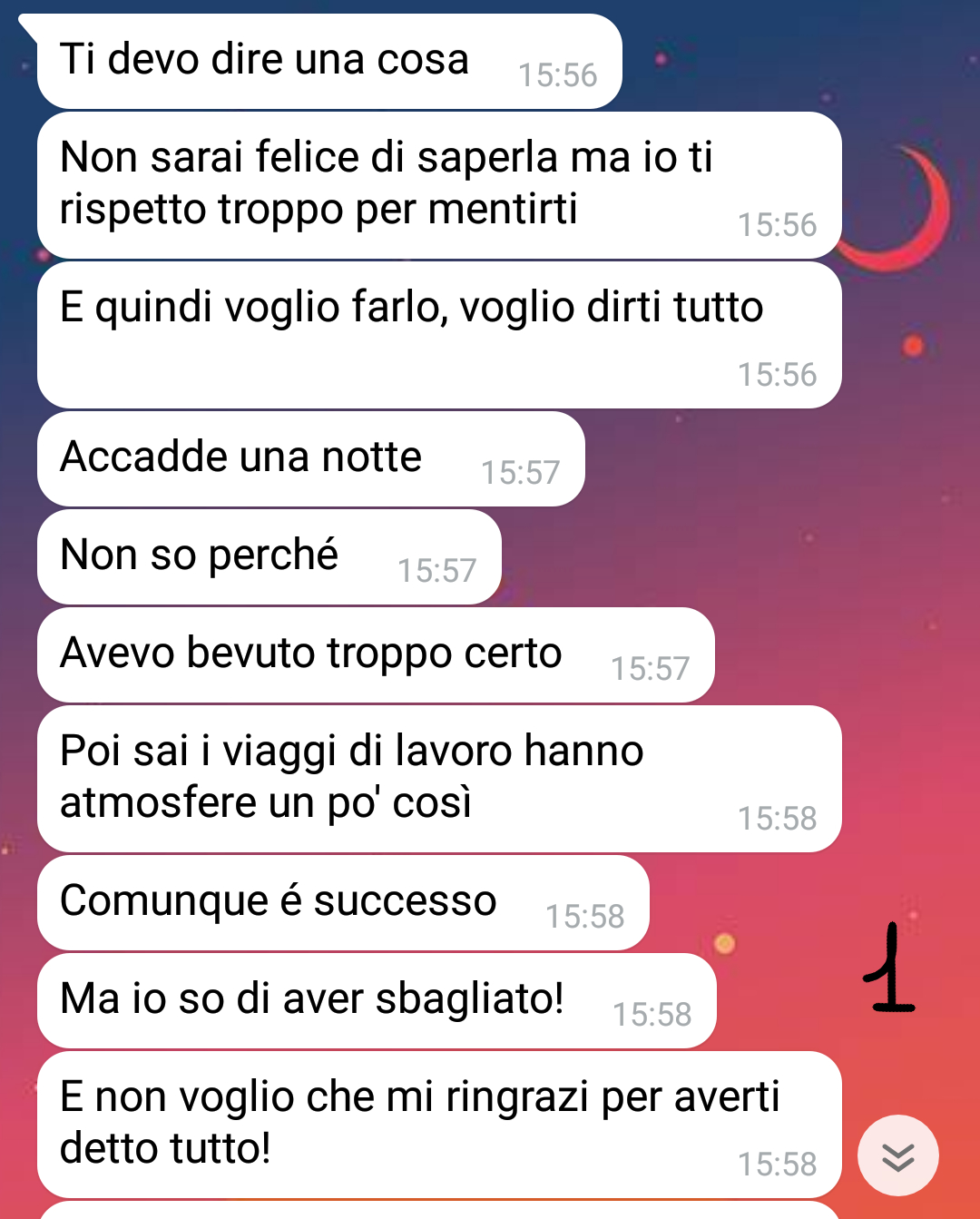 “Un tradimento. Brutta storia. Ma se tutti vedono sempre la cosa dal punto di vista del partner tradito bisogna ricordarsi che c’è anche un’altro punto di vista: quello chi tradisce.