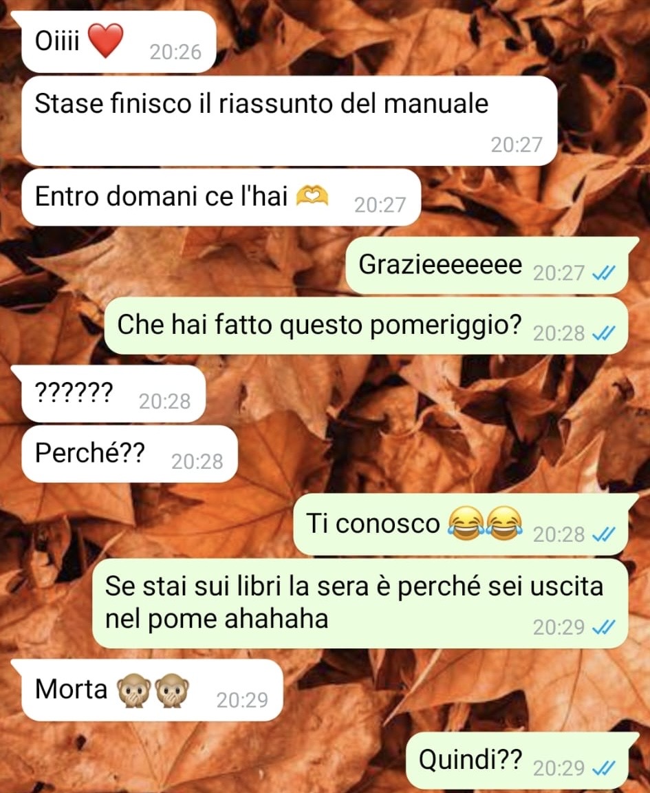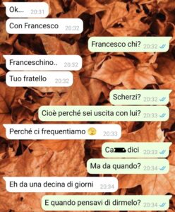 Io nella vita sono buona e cara, ma toccami Francesco e divento una iena. Ha solo due anni in meno di me, lo so, ma per me è tutto. È il classico fratello minore buono, sensibile, che si affeziona in un attimo e che si prende a cuore anche chi non se lo merita. Sono cresciuta con questa sorta di istinto materno nei suoi confronti: quando i miei genitori erano al lavoro, ero io a cucinargli la pasta, a sorbirmi le sue crisi da adolescente, a tenerlo lontano dalle persone sbagliate. E finché ci sono, continuerò a farlo.