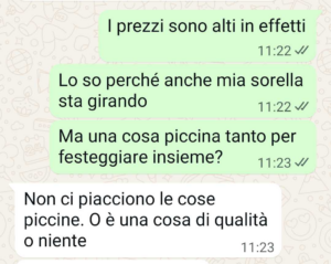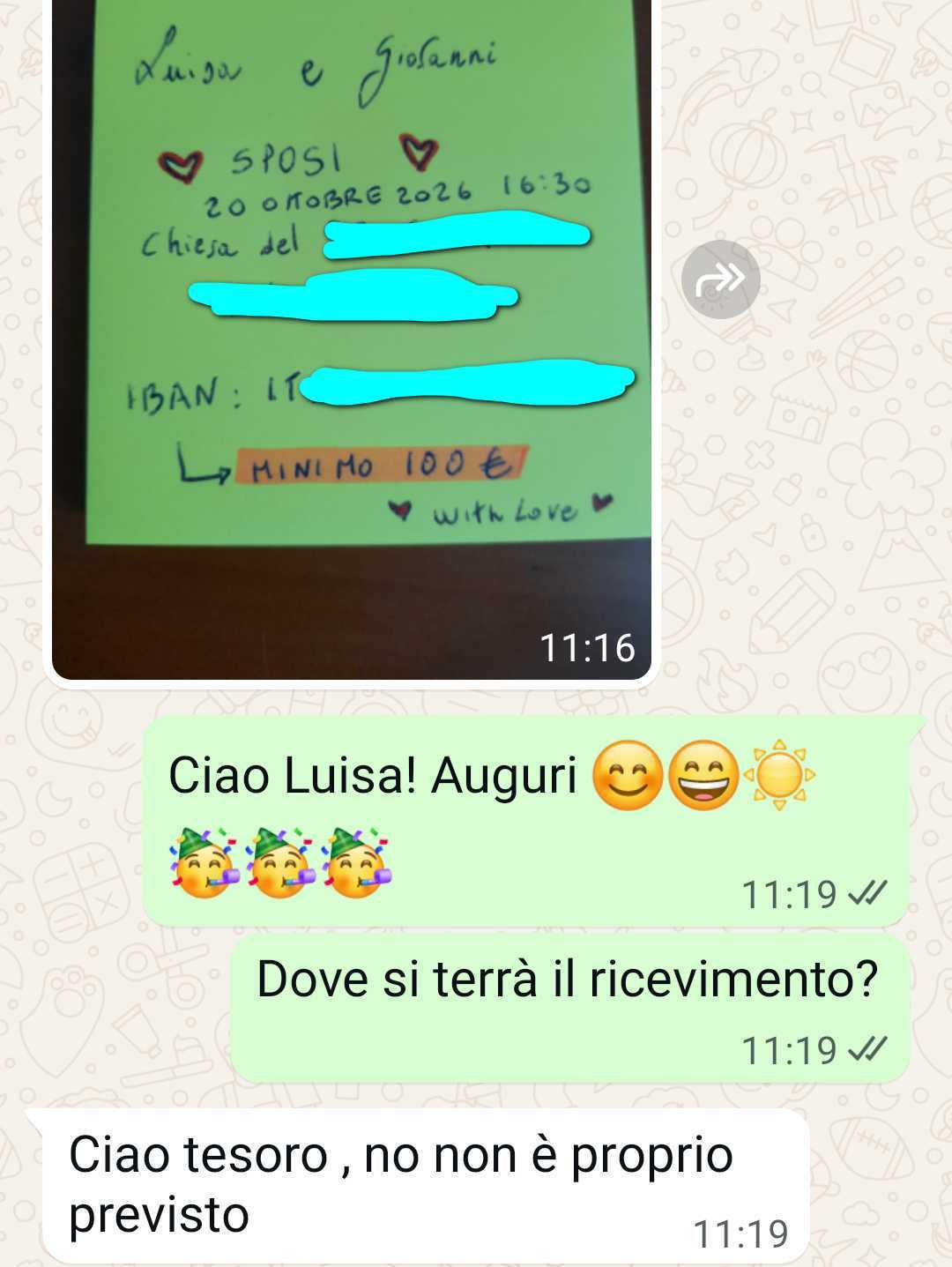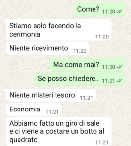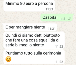 Io vi mando sta chat per chiedere se magari sbaglio io. Cioè non mi sono mai sposata. Non so se ha senso, ma trasformare un invito in un affare e mettere così al centro i soldi in un evento che dovrebbe essere solo romantico, boh, mi sembra strano. In ogni caso ecco come la mia amica mi ha fregata…”