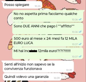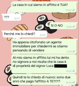Un mese fa una nota agenzia immobiliare ha aperto una sede nella nostra via e ogni tot i tirocinanti (non saprei come chiamarli) vanno a citofonare per capire se ci sia qualcuno interessato a vendere, insomma avete presente. Quindi mi citofona questo tizio e senza volerlo mi rivela che la casa è di proprietà di Luca (i suoi gliel’hanno comprata tot anni prima tramite la stessa agenzia). Io sconvolta gli scrivo e lui mi dà delle motivazioni fuori dal mondo.