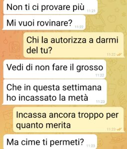 “La guerra con il gelataio scemo e pidocchio. È questa la chat che vi mando amici di spunte. Ad avere questa discussione e stato mio padre con il proprietario di una gelateria del centro. Ho chiesto se potevo mandarla a spunte, e dato che lo scopo è quello di far sapere la verità a più persone possibili… ha accettato facendo trasparire anche soddisfazione per la cosa. Praticamente succede che un sabato sera siamo in questa gelateria con i nonni e gli zii dopo una pizzata. Un casino di gente che non vi dico. Finalmente prendiamo le nostre cose, papà paga per tutti, lascia la mancia e ci spostiamo fuori a cercare qualche panchina. Tutto bene a parte un piccolo inconveniente con l’ordine di mia madre, celiaca, prontamente risolto dal ragazzo del banco. Poco dopo arriva il proprietario che letteralmente placca mio padre in piazza dandogli del ladro. Quello che leggerete è di una settimana dopo, quando questo tizio contatta mio padre minacciando denuncia. Storia allucinante se ce ne una.”