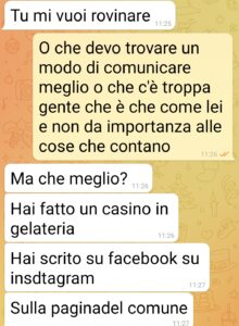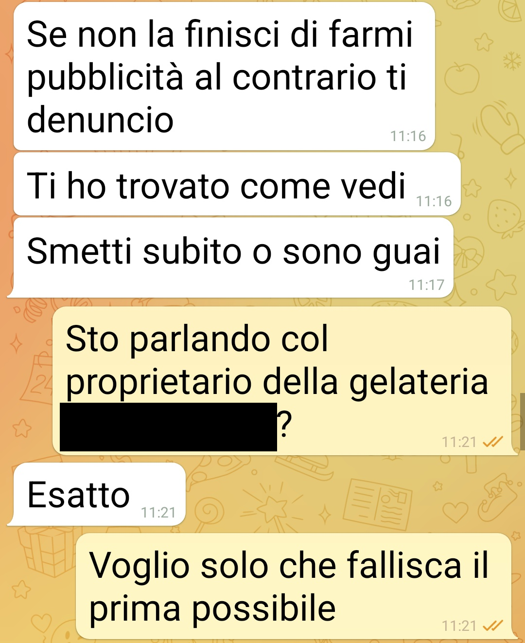 “La guerra con il gelataio scemo e pidocchio. È questa la chat che vi mando amici di spunte. Ad avere questa discussione e stato mio padre con il proprietario di una gelateria del centro. Ho chiesto se potevo mandarla a spunte, e dato che lo scopo è quello di far sapere la verità a più persone possibili… ha accettato facendo trasparire anche soddisfazione per la cosa. Praticamente succede che un sabato sera siamo in questa gelateria con i nonni e gli zii dopo una pizzata. Un casino di gente che non vi dico. Finalmente prendiamo le nostre cose, papà paga per tutti, lascia la mancia e ci spostiamo fuori a cercare qualche panchina. Tutto bene a parte un piccolo inconveniente con l’ordine di mia madre, celiaca, prontamente risolto dal ragazzo del banco. Poco dopo arriva il proprietario che letteralmente placca mio padre in piazza dandogli del ladro. Quello che leggerete è di una settimana dopo, quando questo tizio contatta mio padre minacciando denuncia. Storia allucinante se ce ne una.”