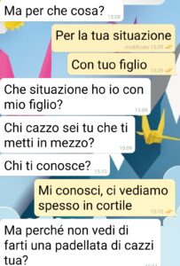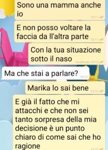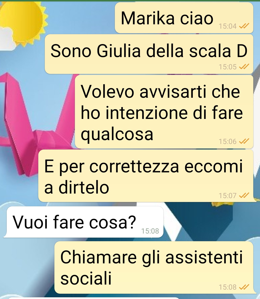 Questa chat l’ho avuta con una ragazza del mio stesso residence appena la settimana scorsa. Voglio farvela leggere perché penso sia importante. È qualcosa di molto serio e penso sia un buon incentivo alla moralità e al senso del dovere di tutti. Non si deve girare la testa da un’altra parte se una faccenda non ci riguarda direttamente.