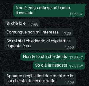 Lo so, faccio pena anche a me stessa. E lo so che ho una faccia triste e angosciata. Cerco di sorridere ma viene fuori un’espressione strana, finta. Non ci riesco. Cerco di farmi forte. Alla mia età non è facile perché tante porte si chiudono. Ho solo mia figlia a cui chiedere una mano e per questo le ho scritto. Ma so di darle fastidio e sembra che non ne faccio una giusta.