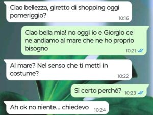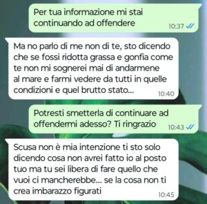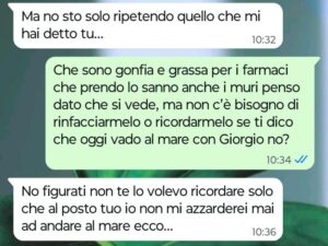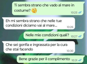 “Ciao Spunte Blu, mi chiamo Giulia e oggi ho capito appieno di avere un’amica veramente infame, perfida e malvagia. Da diversi mesi ormai ho scoperto di soffrire di una patologia piuttosto seria, un disturbo di salute di cui preferisco non parlare nel dettaglio. Questa patologia purtroppo mi obbliga a prendere dei farmaci che mi fanno ingrassare e così oggi la mia amica non ci ha pensato due volte a ricordarmelo e rinfacciarmelo non appena le ho detto che me ne sarei andata al mare con il mio compagno. Si può essere più false e cattive di lei al mondo? Mi sento davvero basita e per questo vi chiedo di leggere la chat incredibile che ho avuto con questa “cara amica”, che amica non sarà più di sicuro per me a partire da questo momento in avanti…”