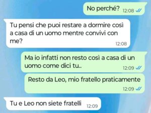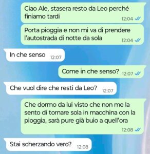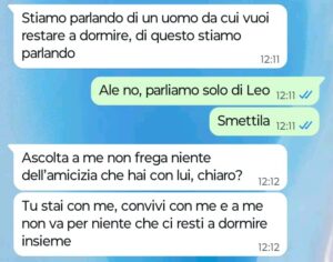 “Ciao Spunte Blu, inizio subito con il dirvi che sono scioccata e a questo punto non ho più assolutamente idea di chi sia davvero la persona con cui sono andata a convivere. Il mio compagno si chiama Alessandro e stiamo insieme da un anno e mezzo, ora conviviamo fuori città e di base tra me e lui le cose non vanno poi così male.. oggi però scrivo ad Ale che stasera sarò impedita a rientrare a casa da lui (1 ora di viaggio) per una serie di fattori e non appena lo informo della soluzione che avrei trovato per la notte (evitando così di guidare fino a casa con il buio e la pioggia) lui esplode, cominciando a dirmi delle cose assurde e insinuando dubbi sulla mia serietà e fedeltà verso di lui. Ho lo stomaco a pezzi dalla rabbia, leggete la mia chat per favore perché mi servono davvero dei pareri esterni. Secondo voi l’amicizia tra uomo e donna non esiste, come sosterrebbe il mio compagno? Io ho esagerato o sbagliato in qualcosa ad informarlo su dove avrei passato la notte? Oppure mi sono solo messa con un paranoico del cavolo e farei meglio a lasciarlo? A mio avviso, al momento propendo per l’ultima ipotesi, ma aspetto comunque dei consigli costruttivi a chi vorrà darmeli. Io non sono quel tipo di donna che accetta di essere ingabbiata e repressa dal proprio compagno. A questo punto se non sono libera di fare quello che desidero, allora è meglio stare single e via. Ho sempre rispettato Ale e non lo tradirei mai, ma nello stesso tempo voglio sentirmi libera di vivere la mia vita senza certi vincoli ridicoli.”