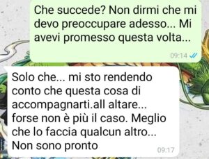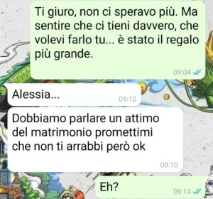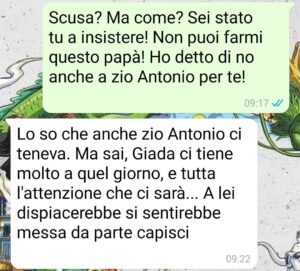 Poi stamattina mi ha scritto quel brutto messaggio. Che ovviamente riguardava Giada, la sua nuova moglie. Diceva scuse come il fatto che non è tranquilla. Che non vuole tensioni.