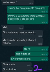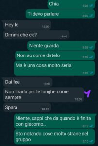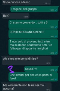 “Per anni ho creduto di avere un gruppo di amici solido, quasi una seconda famiglia. Eravamo in nove: quattro ragazzi e cinque ragazze. Condividevamo tutto, dalle feste improvvisate alle vacanze estive, e io mi sentivo al sicuro. Poi mi sono fidanzata con Giacomo, uno dei ragazzi. Apparentemente per tutti era una cosa naturale, nessuno si è mai opposto, anzi sembravano contenti. Ma quando la storia è finita, ho iniziato a notare atteggiamenti strani. Gli altri tre ragazzi hanno cominciato, uno dopo l’altro, a provarci con me: messaggi privati, battutine, inviti fuori “solo noi due”. Per farsi spazio buttavano merda l’uno sull’altro, come in una gara squallida. Io non mi sono sentita lusingata, ma tradita. Così ho deciso di confidarmi con Mariachiara, convinta che almeno lei e le altre ragazze avrebbero capito il mio disagio. Ma da lì è venuta fuori un’altra verità, molto più dura, che leggerete in questa chat. Chat che è stata come un pugno nello stomaco, di quelli che ti lasciano davvero senza fiato oltre che senza parole.”