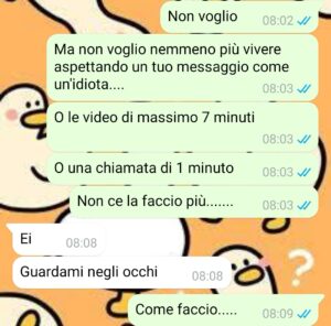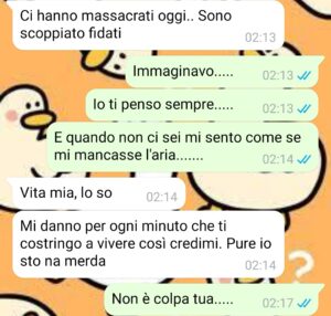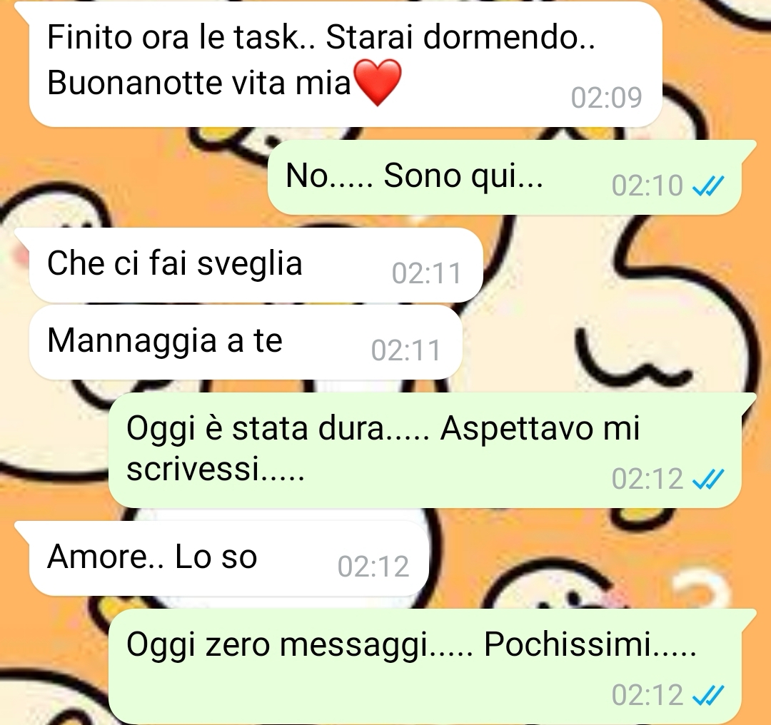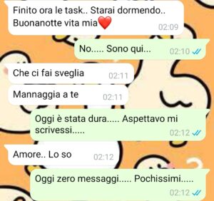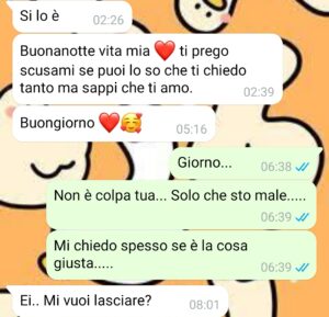 Finché un giorno, una giornata iniziata nel modo peggiore possibile… è finita nel modo che non avrei mai immaginato. Vi mando qui la nostra chat di quella giornata….