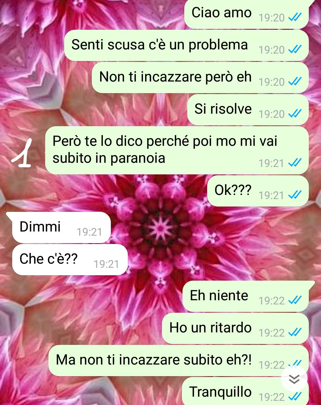 “Sono Marina e ho 21 anni: sono giovanissima e spensierata! Per me la vita è tutta una festa e me la voglio godere a pieno senza pensieri!! Il mio ragazzo Giorgio invece sta sempre a preoccuparsi di tutto, a riflettere e a farsi mille piste mentali manco servisse a qualcosa. Io a volte penso che siamo troppo diversi per stare insieme ma io con lui sto bene così lascio stare.. e poi come dicevo io mi voglio soprattutto godere la vita adesso!! Poi naturalmente questa relazione è importante per me, non credete che non prenda la cosa seriamente: va bene godersi l’attimo ma io a Giorgio lo voglio sposare in futuro, non è che per me questa è una cosa così senza importanza, anzi!! Proprio perché per me è una cosa seria e lui è importante cerco di fare le cose come le vuole lui: ad esempio a Giorgio non gli piace quando non gli dico le cose.. perché a volte io effettivamente magari non gli dico le cose subito e lui si arrabbia perché dice che gli nascondo le cose e non lo faccio partecipe.. e poi appunto lui è tutto precisino.. Quindi quando mi sono accorta che ero in ritardo l’ho subito avvertito…”