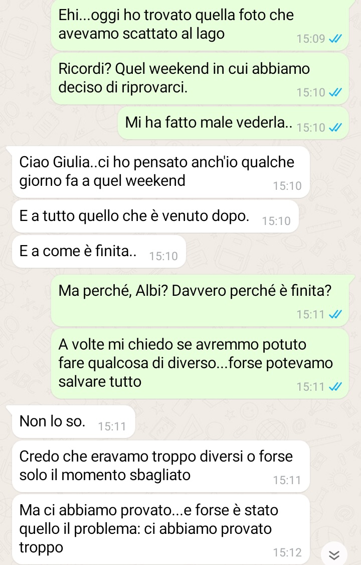 Oggi vi scrivo per condividere con voi una conversazione che mi ha scosso nel profondo. È una chat che ho avuto con un mio ex, una persona che, per molto tempo, è stata il centro del mio mondo. Una persona con cui ho condiviso amore, passione, ma anche dolore e incomprensioni. Una persona che, nonostante tutto, fa ancora parte di me.