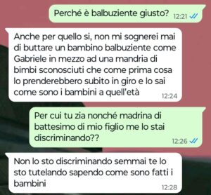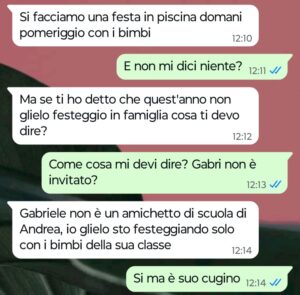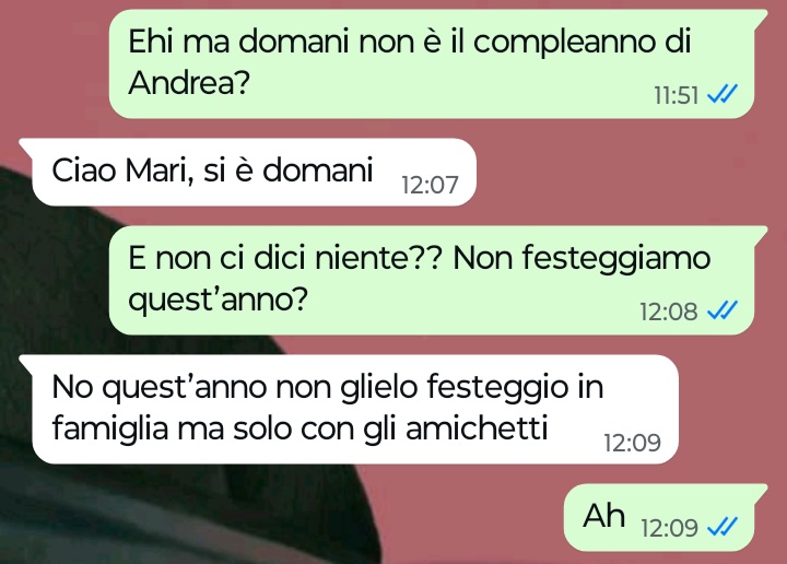 “Ciao Spunte Blu, vi contatto per condividere con voi una chat terribile tra me e mia sorella. Io e lei abbiamo due bambini della stessa età che si adorano e appena sono insieme non fanno altro che giocare h24. Domani sarà il compleanno di Andrea, il figlio di mia sorella appunto, solo che contrariamente agli altri anni quest’anno mia sorella non ci ha detto nulla riguardo al compleanno del bambino così oggi le ho scritto per capire come mai e se forse avesse deciso di non festeggiare. Non vi anticipo altro ma leggete le sue risposte in chat”