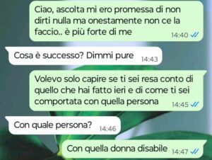 “Ciao Spunte Blu, mi chiamo Federica e vi scrivo da Genova. Ieri sono andata a fare un’escursione con una mia amica ed è successa una cosa che mi ha lasciata veramente di stucco. L’amica del misfatto – con cui oggi ho avuto una chat che vi mando – si chiama Angela. Non posso dire che siamo amiche d’infanzia ne che (per fortuna…) ci conosciamo da una vita ma bensì solo da qualche anno; ecco credo che qualche anno appunto adesso possa anche bastare per mettere un bel punto a questa nostra amicizia, perché dopo quello che ho visto ieri da parte di Angela dubito che vorrò mai più rincontrarla o riparlarci anche solo per un secondo in vita mia”