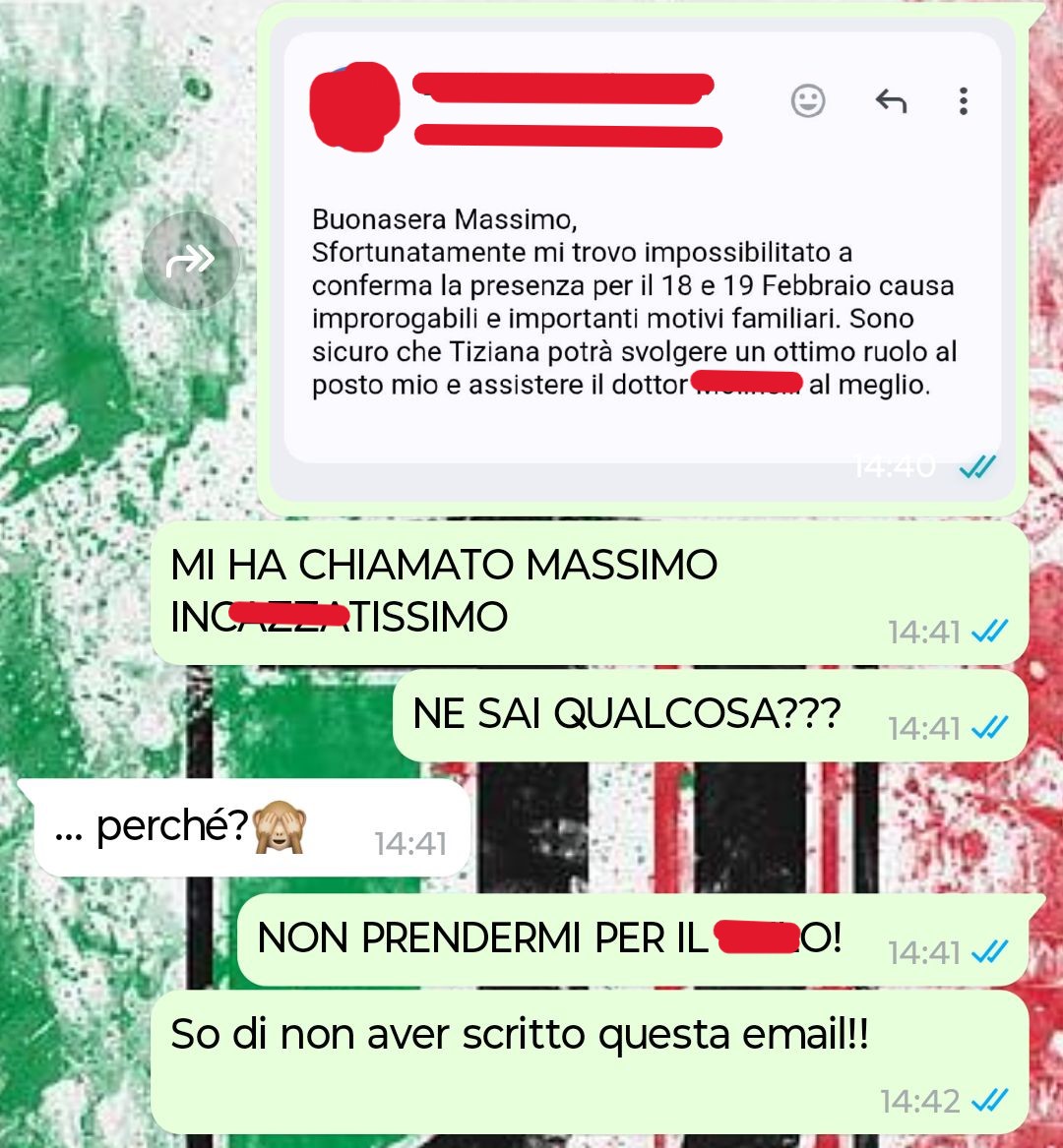 “Mi chiamo Romeo e la mia compagna ha appena distrutto ogni mia possibilità di carriera. Immaginate: il vostro capo della sede principale, che normalmente vedete solo di rado e che sentite quasi solo tramite e-mail, vi chiama furioso e vi vomita addosso una quantità di cose da farvi sentire di nuovo alla scuola elementare. Ora, immaginate di scoprire che è per colpa di una e-mail che non avete mai mandato né scritto, eppure…quella e-mail esiste ed è stata inviata dal vostro account! L’ho aperta immediatamente e ho letto una frase che mi ha fatto mancare il respiro. Diceva che non sarei stato disponibile in una certa data. Due giorni precisi. Peccato che io non avessi mai scritto niente del genere. Ho riletto la mail più volte, controllando ogni parola, come se potesse cambiare. Ho guardato l’orario di invio, il mittente, la firma. Era tutto corretto. Era partita da me. In quel momento non ho pensato a un errore o a un problema tecnico. Ho pensato solo a una cosa: qualcuno aveva risposto al posto mio. Qualcuno che era con me in casa.  Perché quella non era una mail qualsiasi. Era una trasferta fondamentale per la mia carriera. Ho fatto uno screenshot e gliel’ho mandato subito. Prima ancora di scriverle, sapevo già che quella conversazione non sarebbe finita bene.”