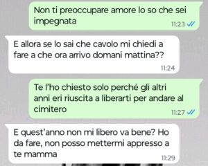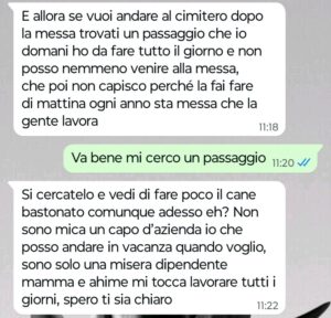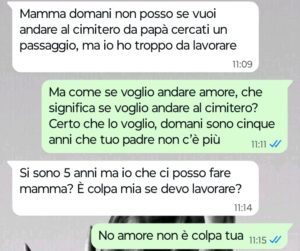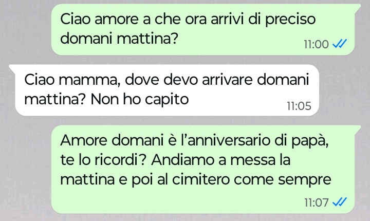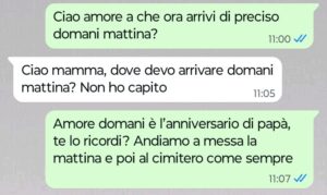 “Ciao Spunte Blu, sono una donna di sessantacinque anni e cinque anni fa purtroppo ho perso il grande e unico amore della mia vita, mio marito Eugenio. Io e mio marito siamo stati insieme per una vita intera, lui era più grande di me di ben dodici anni ma nonostante la grossa differenza d’età tra noi, siamo sempre riusciti a comprenderci e a superare ogni difficoltà insieme. Domani sarà l’anniversario della sua morte e così stamattina ho scritto a mia figlia per sapere a che ora passasse da me domani per andare a messa e poi al cimitero a visitare la tomba di mio marito. La risposta che però ho ricevuto da mia figlia mi ha fatto sentire sola e umiliata anche se ho fatto finta di niente con lei. Vi scrivo per sapere cosa possono pensare delle persone esterne leggendo una chat così. Mio marito mi manca tantissimo e mia figlia non mi sostiene affatto, anzi peggiora la situazione…”