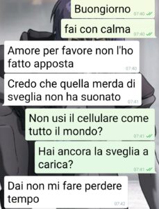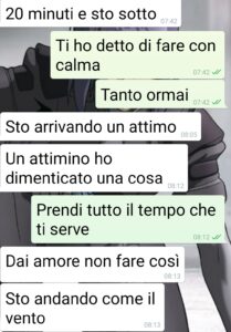 Ciao redazione di spunte blu. Questa è la chat con la mia fidanzata. Chat con lei che scrive ancora e che io ho deciso di non leggere più che già la rabbia è a livello di guardia. E dire che stamattina ero tutto sommato calmo e rassegnato. Cosa è successo? Vivo e lavoro al nord, in un paesino mal collegato e a 3/4d’ora di macchina dalla stazione ferroviaria più vicina. La mia fidanzata abita nello stesso paese. Oggi è il matrimonio di mia sorella, al sud, in un paesino collegato ancora peggio, a un’ora dalla stazione ferroviaria di arrivo. E il tragitto in treno è di 4 ore. E niente macchina, ho un quadriciclo leggero giusto per arrivare alla stazione. Già è da pazzi partire lo stesso giorno del matrimonio… ma cedo per “esigenze” sue. Però orario di partenza alle 6:30. Tassativo. Avete inteso l’argomento di discussione? No? Allora scopritelo, io mi appennico un po’, che manca ancora più di un’ora all’arrivo.”