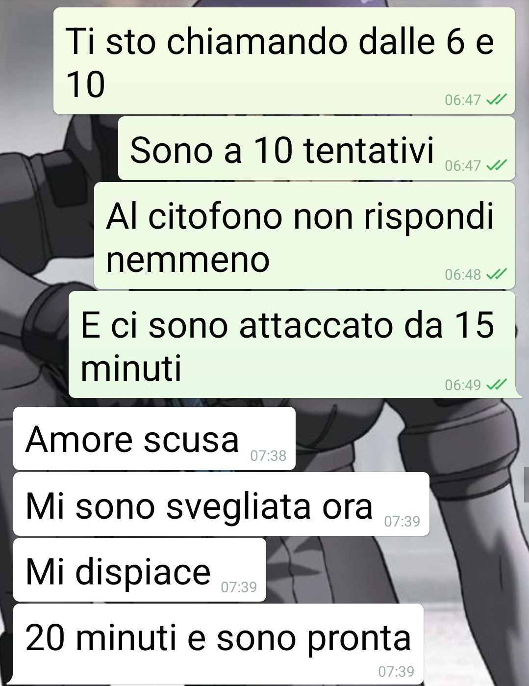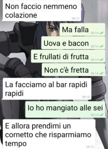 Ciao redazione di spunte blu. Questa è la chat con la mia fidanzata. Chat con lei che scrive ancora e che io ho deciso di non leggere più che già la rabbia è a livello di guardia. E dire che stamattina ero tutto sommato calmo e rassegnato. Cosa è successo? Vivo e lavoro al nord, in un paesino mal collegato e a 3/4d’ora di macchina dalla stazione ferroviaria più vicina. La mia fidanzata abita nello stesso paese. Oggi è il matrimonio di mia sorella, al sud, in un paesino collegato ancora peggio, a un’ora dalla stazione ferroviaria di arrivo. E il tragitto in treno è di 4 ore. E niente macchina, ho un quadriciclo leggero giusto per arrivare alla stazione. Già è da pazzi partire lo stesso giorno del matrimonio… ma cedo per “esigenze” sue. Però orario di partenza alle 6:30. Tassativo. Avete inteso l’argomento di discussione? No? Allora scopritelo, io mi appennico un po’, che manca ancora più di un’ora all’arrivo.”