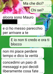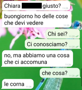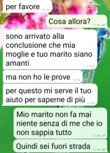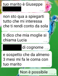 “Ho quasi perso la mia casa, ma forse riesco a recuperarla. Quello che ho perso sicuro e non lo recupererò mai è mio marito. Sono Chiara amici di spunte e sto passando un brutto periodo. Il peggiore della mia vita. Con mio marito Giuseppe abbiamo dovuto lasciare il nostro appartamento, che non era più agibile dopo un danno alle fondamenta del condominio per una alluvione. Da 2 mesi viviamo come sfollti, in attesa di capire come salvare le abitazioni, come intervenire. Non vi dico tutte le assemblee condominiali straordinarie, con comune, periti, ingegneri ecc a cui io mi sono fortunatamente sottratta, ma che Giuseppe si ciuccia da 2 mesi. Almeno così credevo. Perché ieri mi scrive questo Mauro, uno sconosciuto, che insinua che sono cornuta. Anche lui lo è. E vuole il mio aiuto per le prove. Giuseppe se la farebbe con sua moglie. E mi invia i verbali dell’assemblee. Poi il mio confronto con Giuseppe. E adesso sono qui a inviarvi gli screen. A questo Mauro invierò solo l’ultimo. Glielo devo.”