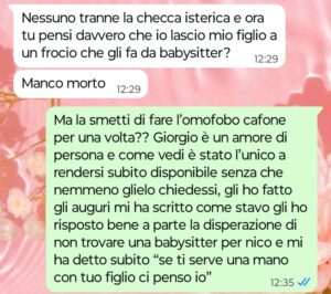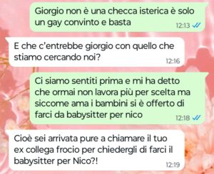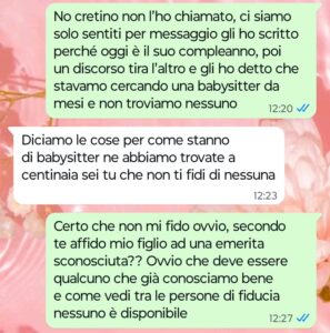 “Ciao Spunte Blu, il mio nome è Elena e sono una mamma molto premurosa e attenta verso il proprio piccolo come tutte le mamme normali che si rispettano. In questo periodo sono praticamente disperata perché avendo ricominciato a lavorare full time fino a tardi la sera mi serve qualcuno che badi a mio figlio Nico di due anni e mezzo per almeno tre volte a settimana. Nico va al nido la mattina ma di pomeriggio deve restare a casa perché il suo nido è aperto solo la mattina e sia io che mio marito lavoriamo fino a tardi quasi sempre adesso. Naturalmente non affiderei certo mio figlio nelle mani di una emerita sconosciuta che non ho mai visto in vita mia e per lui voglio solo una persona che conosco e di cui mi posso fidare ciecamente, in più non voglio trasferirlo in un nido aperto anche il pomeriggio sia per una questione di costi sia perché il bambino si è ormai ambientato bene lì dove sta. Vi mando una conversazione che ho avuto oggi con mio marito sul tema per farvi rendere conto di quello che è successo e dell’atteggiamento che ha avuto mio marito al riguardo. Non è normale per niente e io mi sento davvero irritata e nauseata da certi ragionamenti.”
