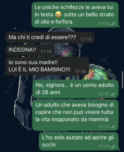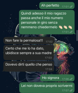 “Ciao spunte blu, sono ancora io, Martina! La ragazza che ha scoperto la verità scioccante sul suo nuovo fidanzato e sua madre. Come avrete letto dalle prime chat, mi aveva promesso che avrebbe smesso di dare certe libertà a sua madre, e per me la cosa era finita lì. Non mi sarei mai aspettata di inviarvi altri screen, e invece eccoci qui… E sapete perché? Perché mi ha scritto proprio lei, sua madre! Accusandomi di cose assurde e assolutamente non vere!