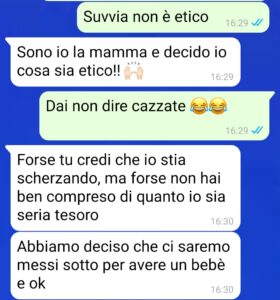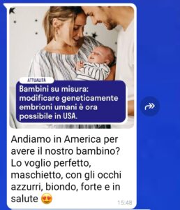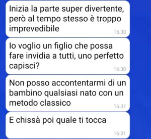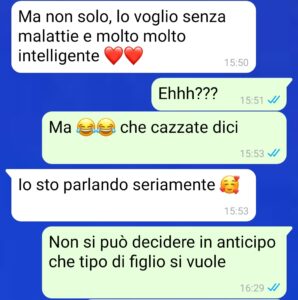 “Ciao a tutti, mi chiamo Enrico e sono fidanzato con Giovanna da qualche anno. Come ogni coppia abbiamo raggiunto diverse tappe della vita, fino a desiderare di diventare genitori. Fin qui tutto bene, se non fosse che la mia fidanzata abbia manifestato delle strane e assurde richieste sulla tipologia di figlio che vuole mettere al mondo. Sì ok, lei è sempre stata un po’ superficiale ma mai avrei pensato che potesse arrivare a tanto, invece mi sbagliavo.. mi sento confuso e abbastanza senza speranze, anche perché io ho 37 e vorrei comunque iniziare a mettere su famiglia prima che il tempo vada oltre, non voglio essere un padre vecchio.. ma inizio a domandarmi se lei sia davvero la persona giusta per me..”