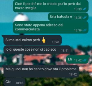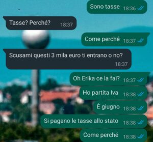 “No guardate, io lo so già come andrà a finire e cosa direte, lo so. Me ne rendevo conto prima e cercavo di passarci sopra. Ora me ne rendo conto davvero. Avviso per i più sensibili: in questi messaggi c’è del vero disagio, altro che veri imprenditori. Sono Guglielmo, sono un giovane sprovveduto che l’anno scorso ha preso la decisione (che ingenuo) di aprire partita iva. E ora, cari, mi toccano le tasse. Ma non è questo il problema, neanche il fatto che ho preso casa (mi hanno aiutato i miei sennò come facevo), neanche la ristrutturazione o gli investimenti per il lavoro, no.. Il vero problema è. con chi ho deciso di “sentirmi” per tre settimane fino all’altro giorno. Erika. Eravamo in fase di conoscenza, sai le solite domande “che fai nella vita?” E cose così. Ma quando ho risposto che ero un libero professionista, con partita iva, Erika si è trasformata di colpo. Gli occhi a dollaro le sono venuti (per modo di dire perché in realtà di fatto siamo usciti poche volte). E ora, ragazzi, ha deciso di dare il meglio di sé, tutto il suo disagio. Però ripeto, io già lo immagino cosa mi direte e sono pronto.”