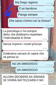 Omar è arrivato all’improvviso e ha reso ancora più bella la mia vita e quella del mio compagno,  Diego. Io sono cresciuta in una famiglia molto numerosa e cattolica e per questo non vedevo l’ora di organizzare il battesimo di Omar e di festeggiare con tutti i parenti e gli amici…ma Diego non era dello stesso avviso. Lui non è credente e ha sempre sminuito il fatto che tenessi così tanto al battesimo. Per me era troppo importante però…e quindi ho deciso che Omar sarebbe stato battezzato. Ho organizzato il ricevimento e invitato amici e parenti ma proprio ieri, a pochi giorni dal battesimo,  Diego si è messo di traverso come non aveva mai fatto prima. Quando ho capito il vero motivo di tutto questo, sono andata fuori di testa. A volte Diego mi sembra completamente fuori…”
