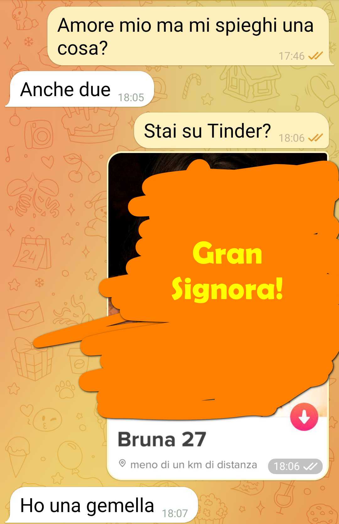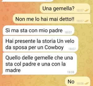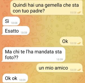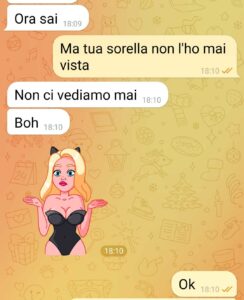 Ora Io sono una persona più tranquilla del mondo,  Ho una mente abbastanza aperta,  e sono convinto che nella vita le coincidenze esistono…  però qualcosa  mi puzzava…  nel racconto della mia ragazza sul perché si trovasse su Tinder pur essendo fidanzata con me tutto sembrava essere assolutamente logico assolutamente chiaro,  assurdo ma in qualche modo coerente.  per questo vi invio la chat…  per mostrarvi la maestria della mia ragazza o la mia paranoia, una delle due..