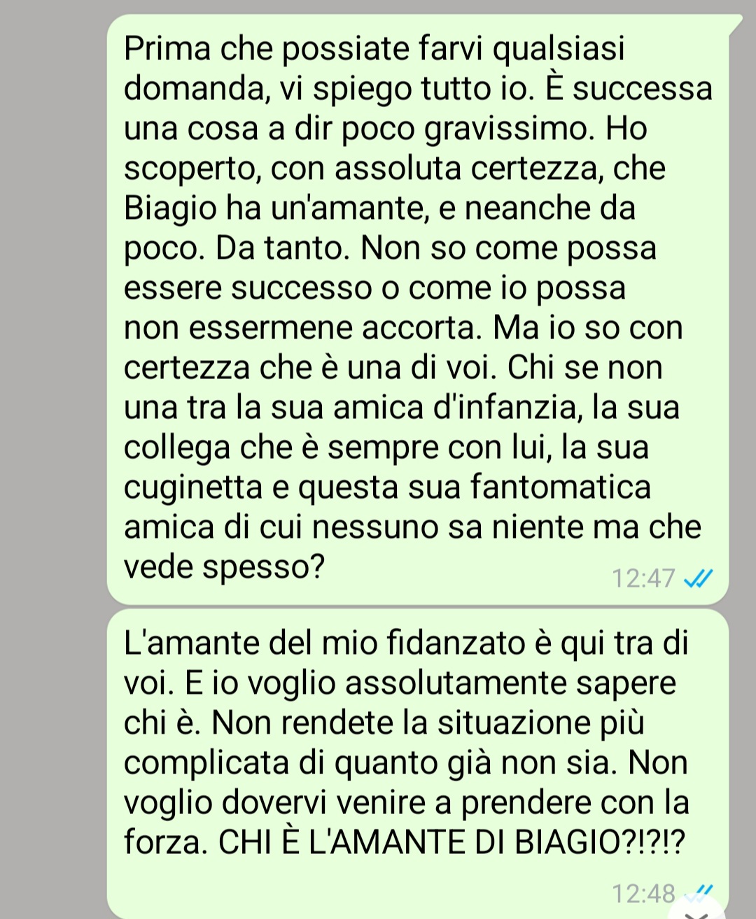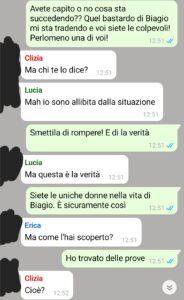 “Vorrei iniziare questa mia presentazione con una premessa molto importante. Io non sono una donna gelosa. Perché esiste gelosia e gelosia. E non dico che una di esse sia giusta ed una sbagliata, no. La gelosia è sempre sbagliata e non esiste gelosia sana. Però, sarebbe superficiale se si etichettasse tutto come gelosia. Perché essere morbosi, controllare il partner, stargli sempre addosso limitando la sua libertà in nome di un amore che probabilmente neanche esiste, sì, quella è gelosia. Non voler essere prese in giro, cercare una comunicazione chiara con il partner ed anche, se si ha motivo, indagare su quello fa quando ci sono fondati sospetti, ecco, questa non è gelosia ma buon senso. Detto questo, dopo anni di relazione, seppur di relazione particolare conoscendo Biagio e il suo modo di vivere (almeno così pensavo prima di tutta questa vicenda), ho scoperto che lui mi tradiva. Dato che, soprattutto ultimamente, la compagnia femminile, anche stretta, fin troppo stretta, non gli mancava, e dato che lui non voleva dirmi la verità, ho creato un gruppo con tutte le possibili amante, per scoprirla io stessa.”