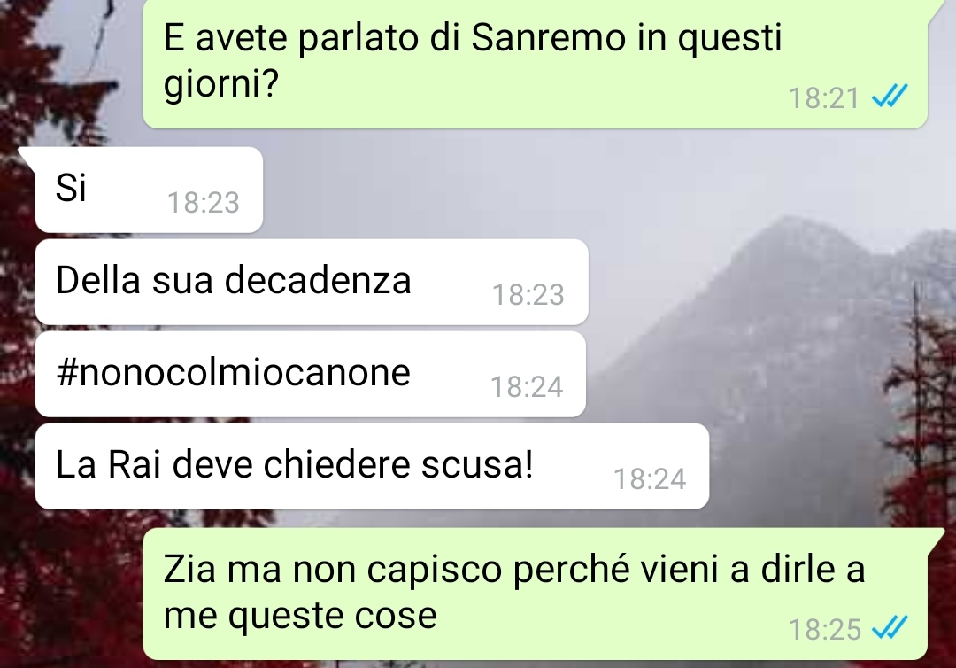 Questa volta i soggetti della critica e dell’invettiva di mia zia sono parzialmente diversi, ma il risultato, il succo della questione, non cambia affatto, anzi, i toni sono anche più aspri e lei è molto più cattiva rispetto alla scorsa volta, questa 72esima edizione del festival di Sanremo non le ha fatto per nulla bene, proprio no.