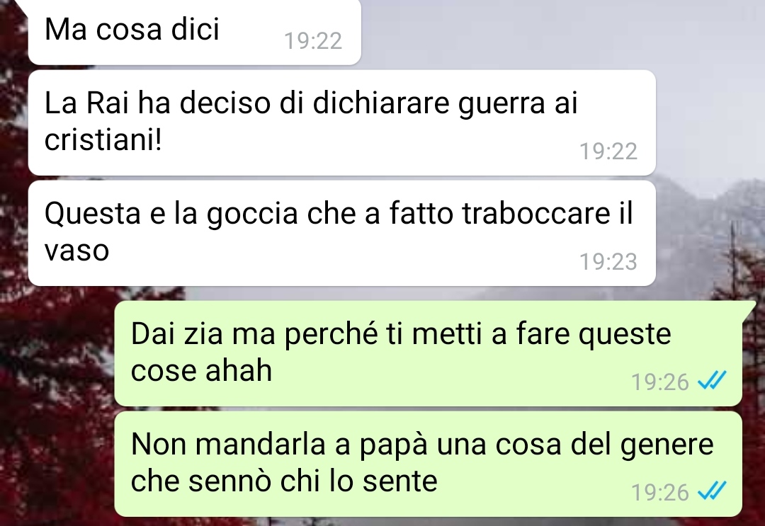“Ciao Spunte Blu, vi scrivo per mandarvi questi screenshot freschi freschi dalla chat con mia zia. Lei è la sorella di mio padre e con lui sono il diavolo e l’acqua santa, e non figurativamente, ma veramente, letteralmente. Mia zia è una donna che ha dato tutta la sua vita alla chiesa anche senza essere mai diventata suora non so per quale motivo non chiedetelo a me, ma è così, lei va ogni giorno in chiesa, la domenica e i festivi due volte, la mattina e la sera, quando io, mia sorella, i miei cugini eravamo piccoli ci portava al catechismo, all’oratorio e tutte queste cose.