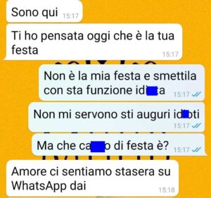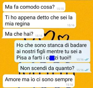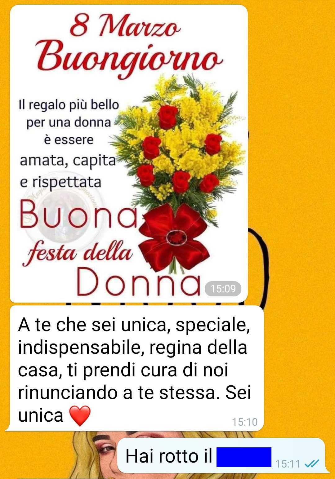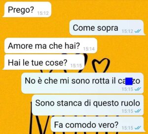 Non ho respiro e quando torno a casa da lavoro mi tocca lavorare ancora coi bambinj quando avrei solo voglia di piangere e urlare devo invece mantenere la calma fare la mamma giocare. Ma io non reggo più. Sono scoppiata per sti auguri della festa della donna del ca**.. ho proposto a mio marito un accordo. O così o sarà peggio per lui… Che ne pensate del comportamento di mio marito????”