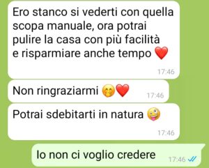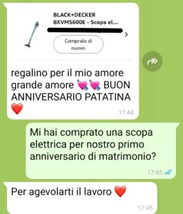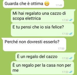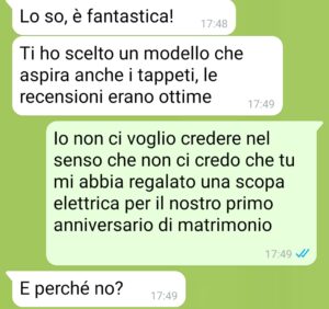 “Ciao, mi chiamo Enrica e sono sposata da un anno con Fabrizio. Lui è un uomo molto classico, rude, forte, bello è un po’ all’antica, però so che mi ama e mi ha sempre trattata con immenso rispetto. Poco tempo fa abbiamo festeggiato il nostro primo anniversario di matrimonio, ci siamo promessi di farci un pensiero senza sorprese, e così ho fatto. Solo che lui mi ha regalato una scopa elettrica e si è arrabbiato perché io non ho apprezzato il regalo. Cioè, ma vi sembra il regalo per un primo anniversario di matrimonio? Io non chiedevo granché, ma sicuramente non un’aspirapolvere…”