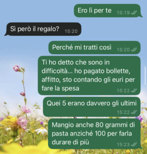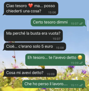 Ha iniziato a parlarmi di soldi, a dirmi cose strane e offensive… ero scioccata perché lei non è mai stata una persona del genere, anzi. Poi parlando mi ha confessato la verità. Sono stata una stupida, lo ammetto. Ho proprio sbagliato… non so come farmi perdonare adesso.