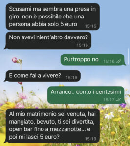 Il suo matrimonio è stato bellissimo… un trionfo d’amore ed eravamo anche in tanti. Abbiamo mangiato, bevuto, ballato, cantato… solo che il giorno dopo mi ha chiesto una cosa davvero strano che riguardava la busta.