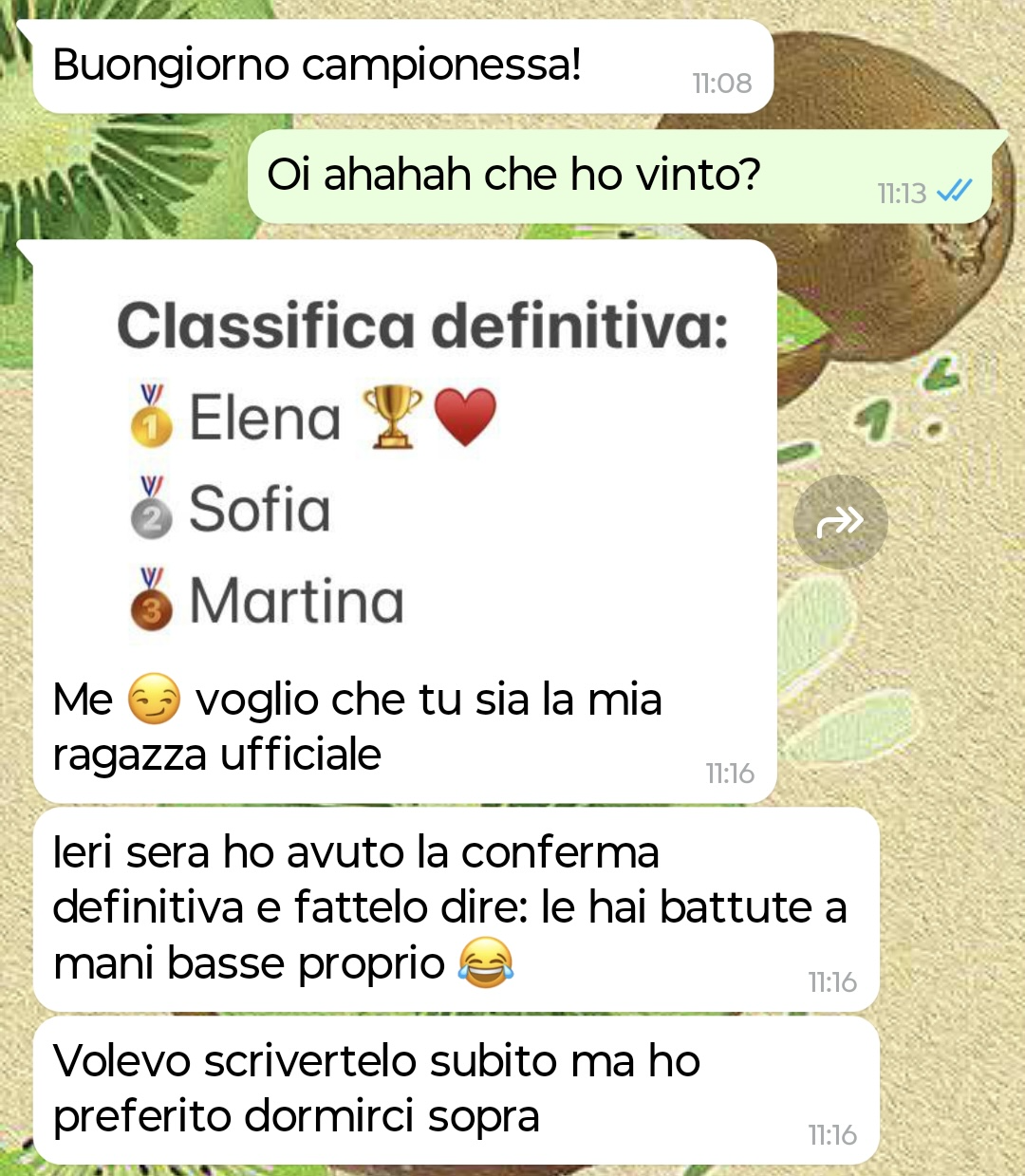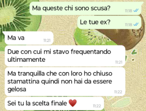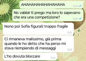 Comunque una sera usciamo e la mattina dopo mi arriva sto comunicato ufficiale che ho vinto la competizione per essere la sua ragazza, battendo le altre due ragazze che stava frequentando (e valutando) contemporaneamente a me.