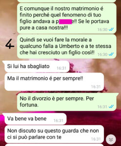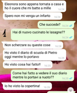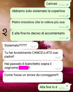 Ora a dire il vero qualcosa il mio ex a noi ha lasciato: sua madre Enrica, nonna di Pietro e mia ex suocera. Per Enrica il legame di “sangue” è sacro e indissolubile, anche se il “sangue” non si presenta ai compleanni e non paga il mantenimento. Quindi sapevo che Enrica avrebbe reagito male alla rimozione del cognome di suo figlio e che ne avremmo dovuto “parlare”.. ma l’aspettavo al varco, dato che avevo anche un’altra cosa da dirle..”