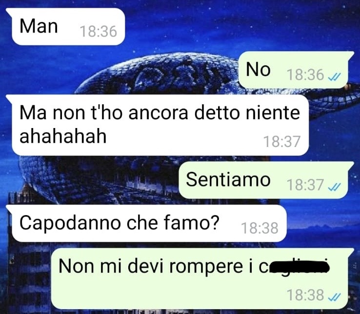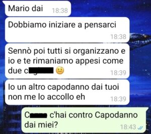 Mi ha scritto avevo appena discusso con una delle mie sorelle, Greta, che ha da sempre una cotta per lui (cosa che lui sa benissimo) e in quel momento l’ultima persona che volevo sentire era proprio Daniele. Parte in sesta con sta storia di Capodanno, deciso a fare qualcosa di figo quest’anno e mi chiede delle proposte concrete. A settembre.