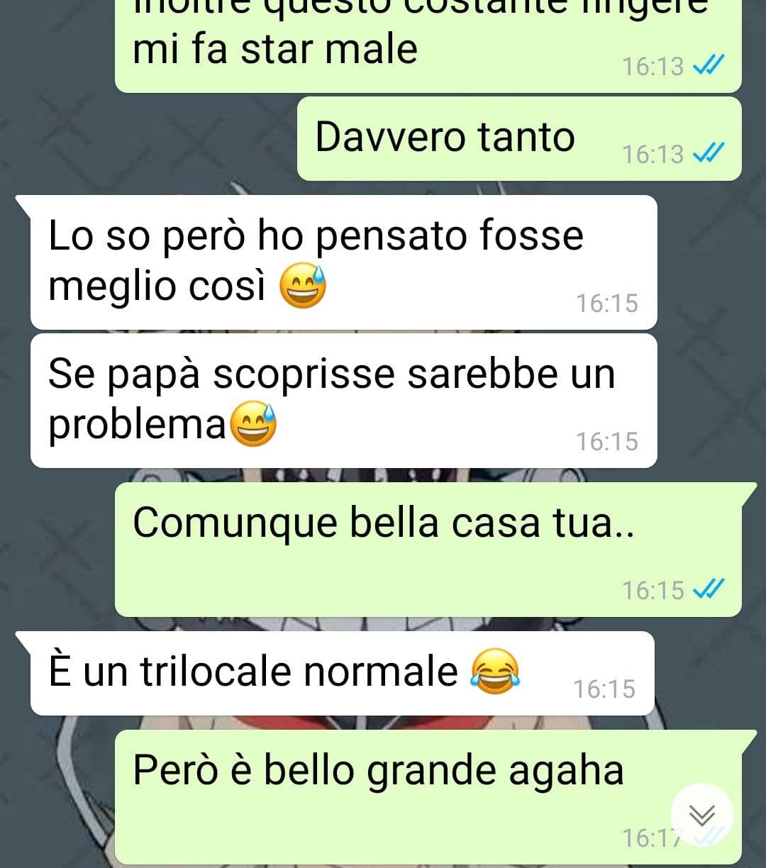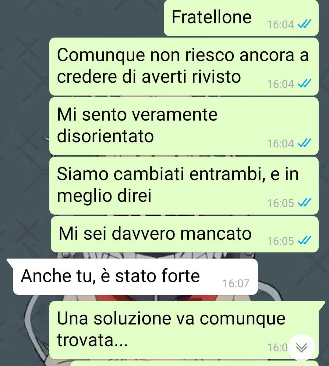 Mio fratello mi ha fatto vedere casa sua, abbiamo parlato ed anche molto. Così quando gli ho riscritto gli chiesto un paio di cose, perché a me era venuta una idea, non geniale, ma era comunque una soluzione. Avevo intenzione di dire tutto a mia mamma, dalla prima all’ultima cosa. E così ho fatto.