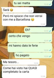 “Ciao a tutti quelli che mi leggeranno. Vi sto scrivendo da Barcellona in questo momento. Un modo per dare una bella lezioncina alla mia ragazza, Giulia, che stavolta ha proprio esagerato.