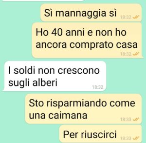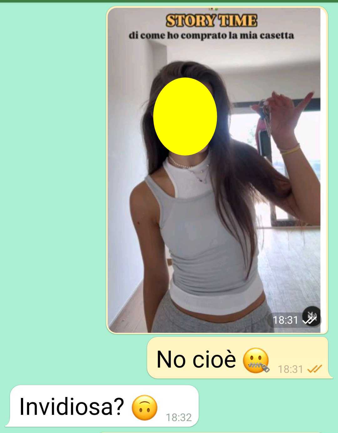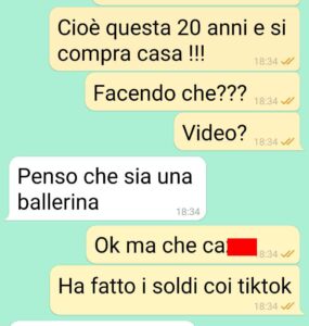 L invidia è tanta ma sta mia amica con cui ho parlato in chat parla tanto e difende sta tizia perché anche lei è un’altra privilegiata del ca***. Niente ne ho per tutti. Certo… perché non tt abbiamo potuto studiare, farci i master, o avere tempo per fare i tiktok o la voglia di fare balletti.