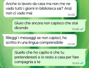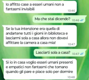 “Buongiorno Spunte Blu, sono una povera ragazza fuori sede e come tutti quelli nelle mie condizioni sono costretta ad affittare sempre case in giro per l’Italia in dipendenza del lavoro, condividendo quindi gli spazi con gente perlopiù sconosciuta… i famosi inquilini. Ho sempre lavorato in ufficio ma da pochi mesi a questa parte ho ottenuto la possibilità di lavorare da remoto con solo un giorno a settimana in presenza quindi la casa mi serve comunque perché io sono siciliana e il mio ufficio attuale si trova a Roma. Avevo creduto di aver trovato finalmente una casa carina da condividere con una ragazza che sarebbe anche la proprietaria dell’immobile, ma leggete cosa è successo stamattina dopo la prima notte passata in casa da questa tipa. Cioè mi sono trasferita ieri e già stasera andrò via, con tutti i problemi logistici che questo comporterà per me, ma pazienza… a casa con una matta del genere non ci resto nemmeno un giorno in più… la gente sta davvero fuori di testa e il bello è che hanno pure le case pronte comprate da papino…”