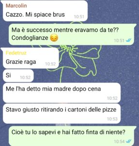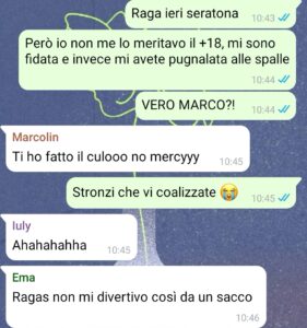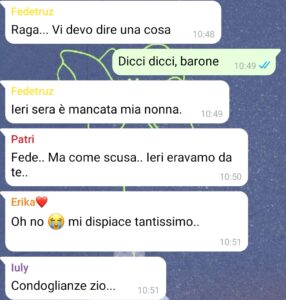 “Mi chiamo Isabella e con questa chat ho pianto tutte le mie lacrime, ma ho anche capito una cosa: a volte i nostri amici non chiedono aiuto perché non vogliono “pesare” e noi crediamo che l’amicizia sia esserci solo nei momenti tristi, con le parole giuste, ma spesso l’amicizia è esattamente l’opposto, è essere in una stanza piena di vita quando la vita, fuori, fa paura, è stare senza aggiustare, è ridere senza sentirsi in colpa. È restare. Bene, fatte le premesse mando a voi di “Mentire di fronte alle Spunte Blu” questa conversazione sul gruppo dei miei amici perché in realtà tutto è iniziato cona sorta di “bugia”. Avevamo organizzato una serata giochi da tavolo (noi siamo appassionati, anche se per i vari impegni di ognuno non riusciamo spessissimo) in cui ci siamo divertiti un mondo, come non ci divertivamo insieme da una vita, tra tutte le preoccupazioni della vita (abbiamo tutti tra i 25 e i 32 anni). Però, per tutta la serata, il nostro amico Federico ci ha mentito, e quando l’ho scoperto il motivo mi ha devastata dentro. Ho capito quanto volessi bene a ognuno di loro, siamo come una famiglia.”
