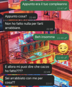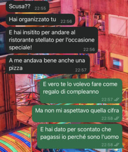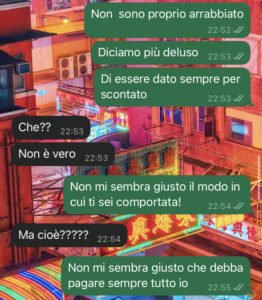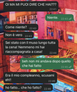 Alla fine ci sono rimasto male per il suo comportamento, molto male. Quindi non l’ho voluta riaccompagnare a casa. Poi lei mi ha scritto dicendomi che ho avuto il muso tutta la sera… beh ci credo, dopo quello che aveva fatto.