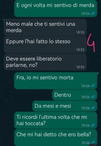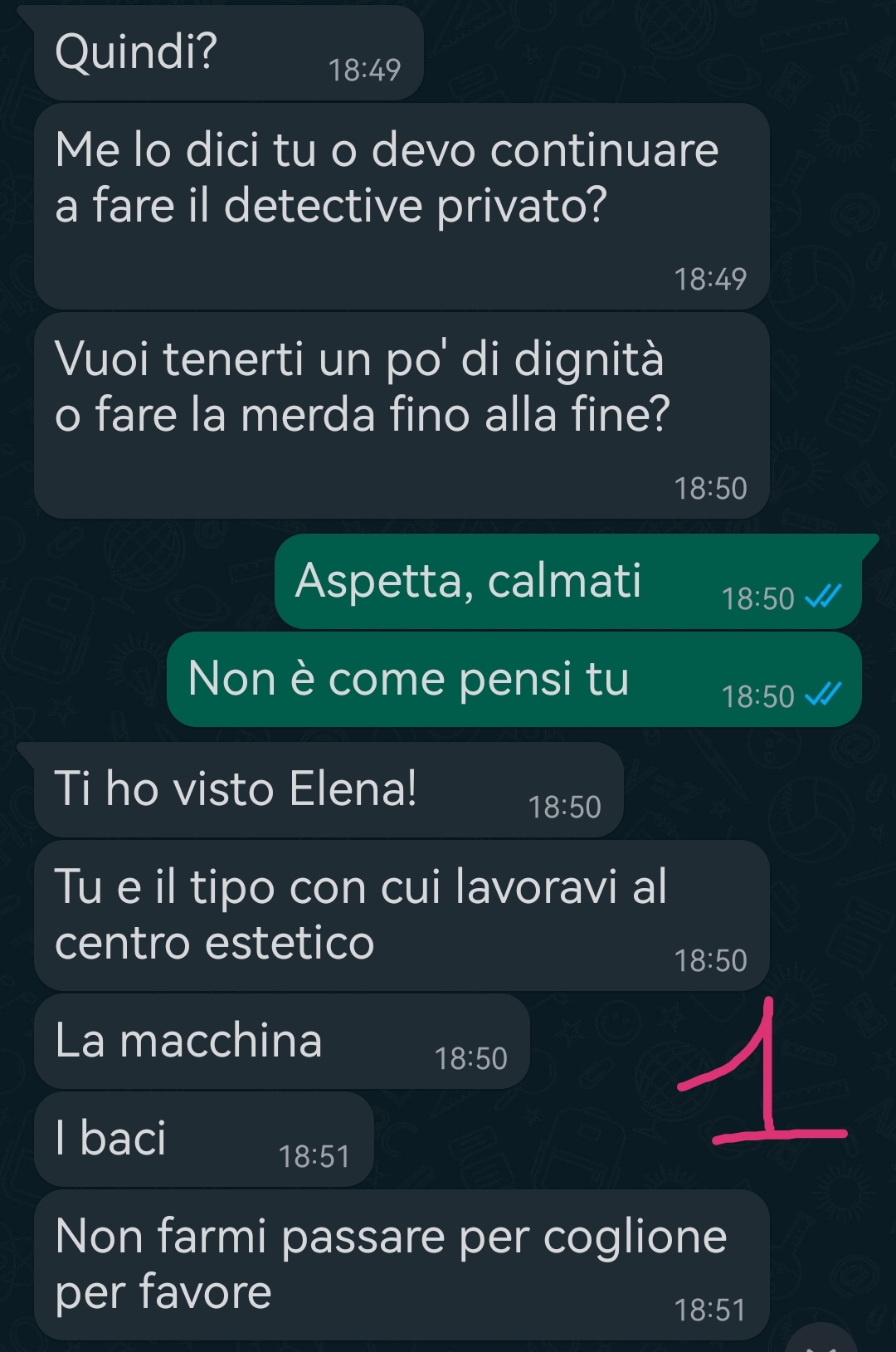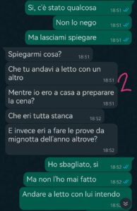“A volte le bugie non nascono da malizia, ma da disperazione. E a volte un tradimento non è solo sesso o infedeltà. Io con Francesco stavo da quasi cinque anni. Avevamo casa insieme, routine, affetto… ma ormai da mesi non c’era più contatto, dialogo, nemmeno un bacio vero. Un giorno ho fatto una cosa che nemmeno so come giustificare. Ma non è quello che pensate. Vi lascio la chat. Perché a volte non si tradisce un corpo, ma la fiducia. E fa anche più male. Mi dispiace, ma forse è stata la scelta migliore con le conseguenze giuste.  Vorrei però la vostra opinione.”