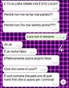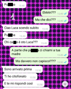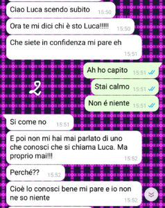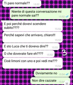 Sono stanca di sentirmi sotto interrogatorio per colpe che non ho e di dover giustificare persino il tempo che ci metto a fare la spesa. L’altro giorno però ha davvero toccato il fondo per una banalità assurda, scatenando una discussione che mi ha fatto capire una cosa fondamentale: la situazione non migliorerà mai, può solo peggiorare! Vi mando gli screenshot perché voglio che vediate a che livelli di follia può arrivare la paranoia!! In ogni caso sappiate che ora io sono single!!”