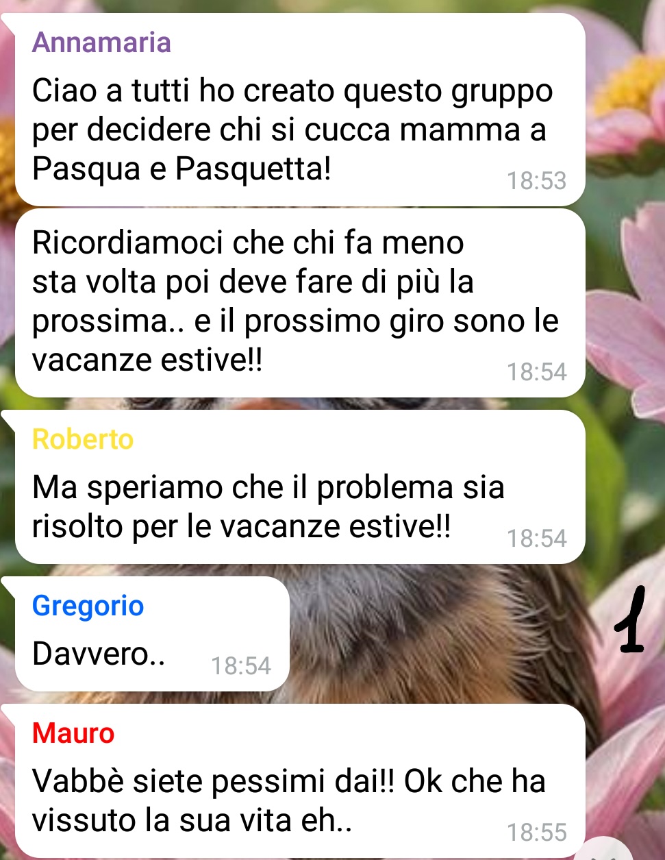 “La signora Fernanda ha avuto diverse disgrazie nella vita. Per prima cosa certamente il fatto di aver ricevuto un nome così brutto alla nascita.. anche se forse quello è stato un triste presagio dell’esistenza non proprio serena che l’attendeva! Fernanda è cresciuta in una famiglia per cui, onestamente, lei ha sempre costruito semplice tappezzeria, a volte neanche tanto gradita. Giovane ma non giovanissima – d’altronde non era certo una bellezza, come le faceva sempre notare sua madre! – si è sposata con il primo uomo che ha mostrato un minimo di interesse nei suoi confronti. La scelta si è rivelata con lo scorrere degli anni né infelice né felice: il matrimonio di Fernanda è stato così, insipido, senza veri drammi ma neanche senza la minima ombra di gioia. Tra un lavoro noioso che non le piaceva e che svolgeva solo per arrotondare lo stipendio del marito – e che comunque la impegnava poche ore a settimana – e la scarsa se non nulla felicità coniugale, la vita di Fernanda è sempre stata se non proprio grigia decisamente beige. L’unica gioia di Fernanda sono stati i figli: ben 5! Stringere il suo primo figlio tra le braccia è stato forse l’unico momento di reale felicità della sua vita, da qui la volontà di averne il più possibile. Sui suoi bambini Fernanda ha riversato tutto il suo amore, illuminandosi quando loro, che da piccoli vedevano la loro mamma come l’intero loro mondo, le sorridevano con calore. Forse per questa sua fame di affetto e attenzione li ha viziati in maniera sconsiderata.. Comunque gli anni sono passati. I figli di Fernanda sono cresciuti e si sono costruiti la loro vita. Oggi Fernanda ha 87 anni e la demenza senile da 3 anni, la sua salute peggiora di giorno in giorno. Ormai vedova da anni, vive da sola con una badante. E suoi figli sono tormentati da un solo dubbio: chi si tiene mamma a Pasqua?!?”